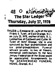 Daughter Dorothy V. Smith of Hillburn, 2 Sisters Josephine Ransom of Walden, NY, Williametta Miller of Goshen, NY, 3 grandchildren, 2 great grandchildren. Funeral was Thursday, Ocotober 31, at Wanamaker and Carlough Funeral Home in Suffern, NY, Interment was at Airmont Cemetery."