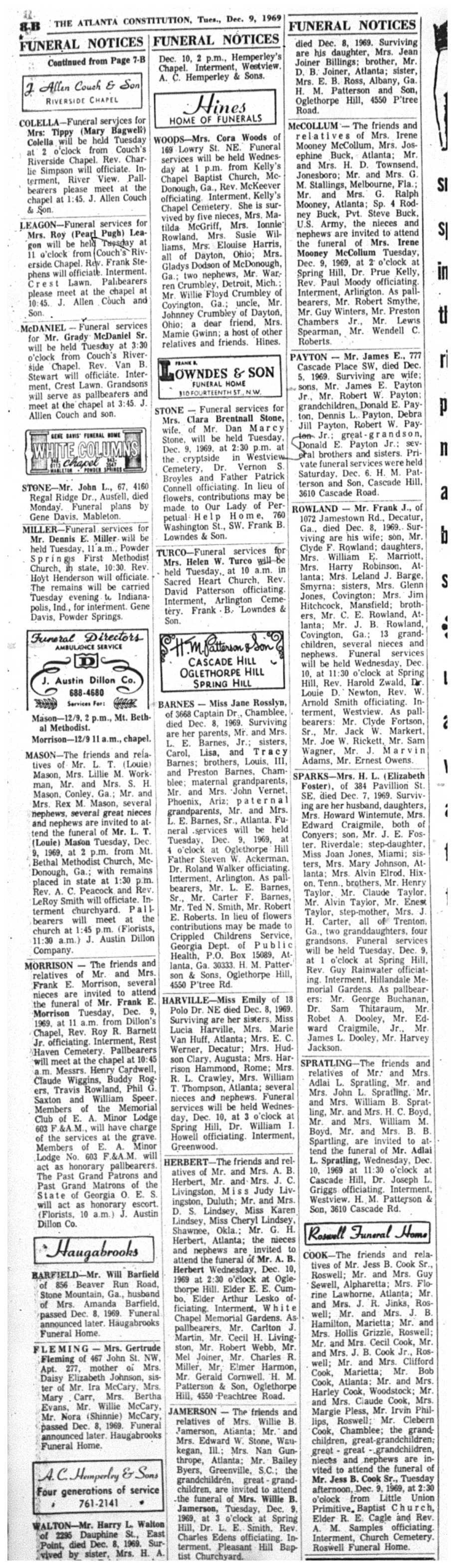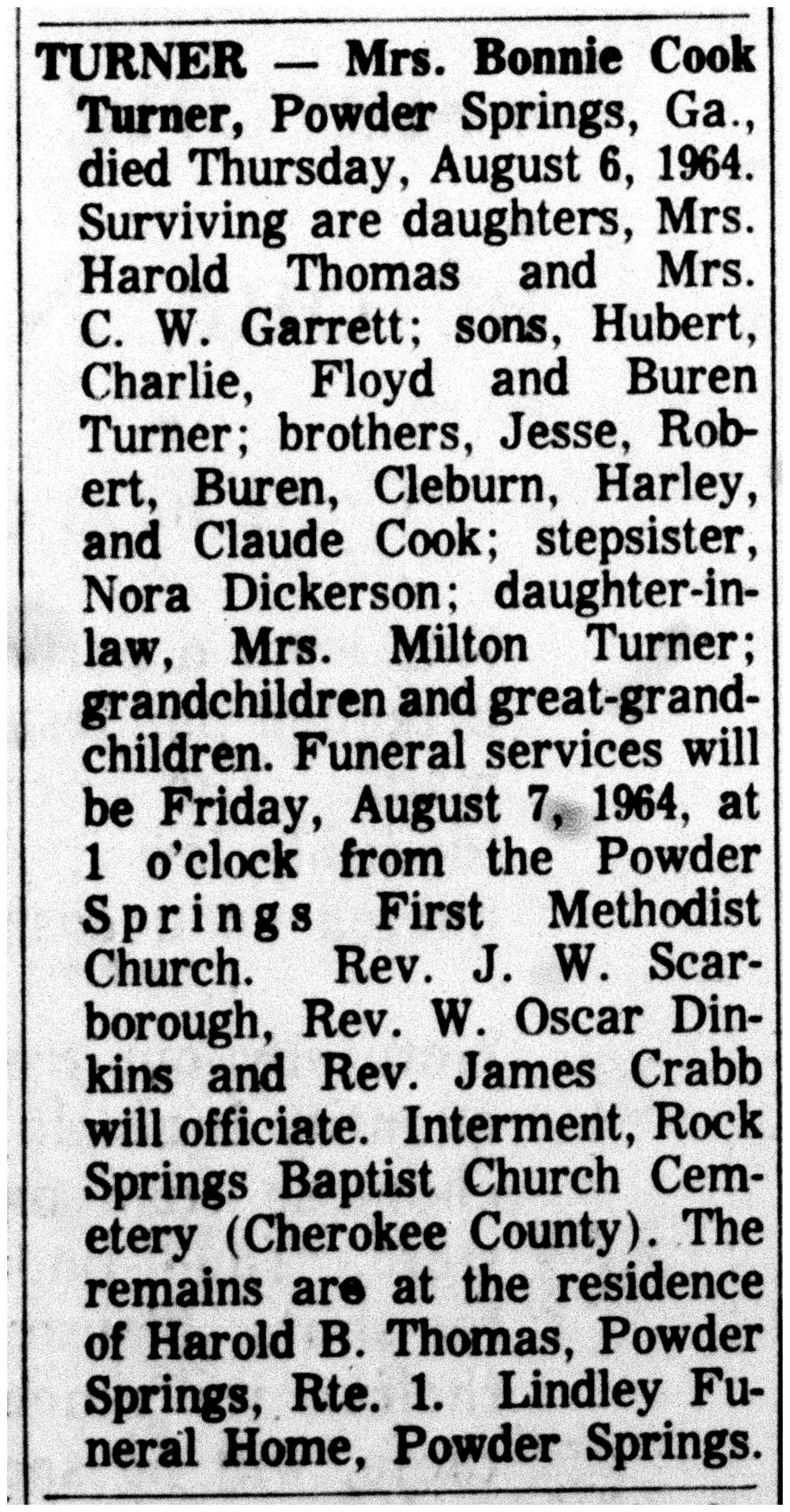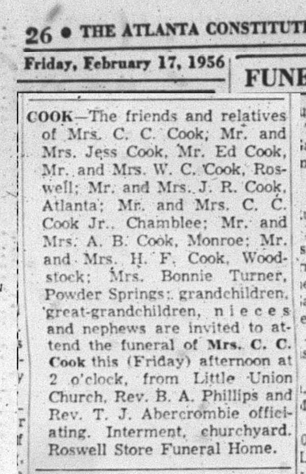 58. “Funeral notice for Betty Jean Cook,” Atlanta Constitution, Atlanta, GA, 7 Apr 1952, page 18.
