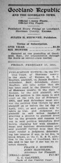 !REFERENCE: 24-Feb-1911 The Goodland Republic and Goodland News, Goodland, KS, page 2, S. E. Braffett vs. Jennie Braffett