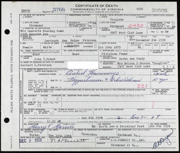 08-Dec-1959 Richmond, VA, death certificate for Gertrude Ann Haine Peterson